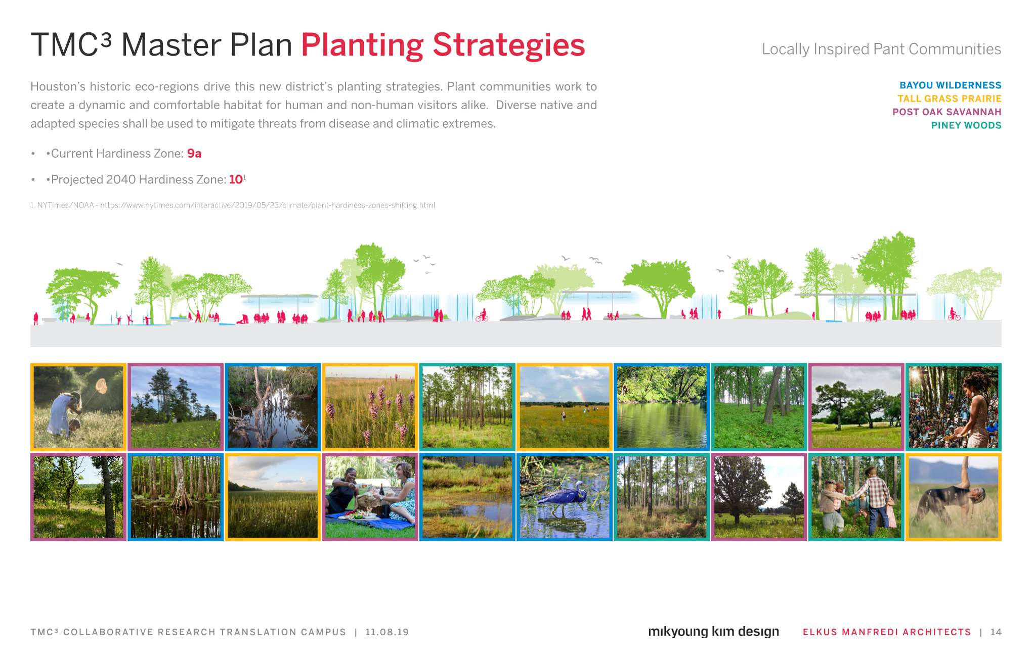 In collaboration with Elkus Manfredi Architects, the TMC3 Innovation Park is a collaborative research campus woven together by six interstitial gardens. The project’s proximity to Brays Bayou and its lying within the 500-year floodplain necessitated increasing water-holding capacity on site. This is supported by 11.5 acres of open space and a below-grade cistern capable of holding 2.3 million gallons of water.